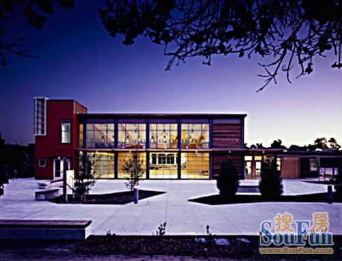 6. 波托拉谷镇中心,处于圣安德列斯断层上。过去的城镇中心在地震中被破坏,抢救下来的木材被再用于新镇中心外墙和天窗的建设。新落成的镇中心,融图书馆、社区会堂和市政府为一体,比过去的规模小20%。中心还配备了节能空调系统和太阳能发电系统,提供了中心约40%的能源使用。