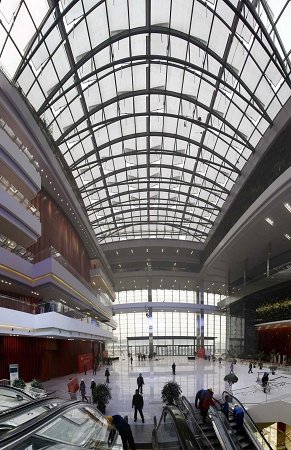 世博中心模数化的构造使空间组合能够达到最大的灵活性。天花板造型充分结合建筑结构形式,整个空间可用移动隔墙体系分隔成3至4个均质空间,并通过不同的照明系统满足其特殊的需求。世博中心屋顶有直升飞机停机坪。